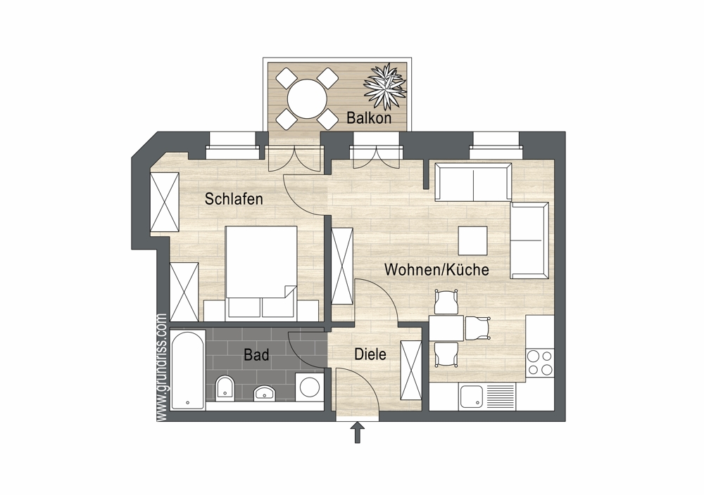 Der durchdachte Grundriss mit zwei gut geschnittenen Zimmern bietet vielseitige Nutzungsmöglichkeiten und schafft ein angenehmes Wohngefühl. Die offene Einbauküche ist harmonisch in den Wohnbereich integriert und lädt zum gemeinsamen Kochen ein. Vom Wohnraum aus gelangen Sie direkt auf den Balkon – ideal für entspannte Stunden im Freien.