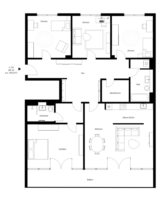 Die 2- bis 5-Zimmer-Wohnungen bieten dank ihrer optimalen Raumaufteilung vielfältige Nutzungsmöglichkeiten. In den offenen Wohn- und Küchenbereichen sorgen die großen Fenster für viel Licht und schaffen ein großzügiges Raumgefühl..