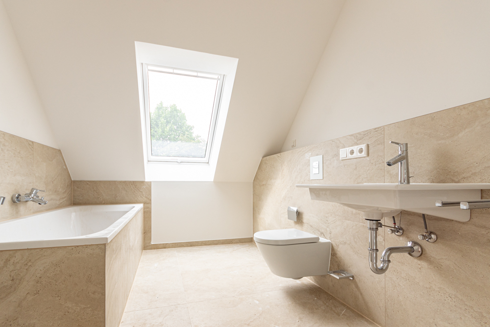 Zwei Tageslichtbäder erhöhen den Wohnkomfort: Eines ist mit einer Badewanne und Waschmaschinenanschluss ausgestattet, das andere verfügt über eine bodengleiche Dusche.