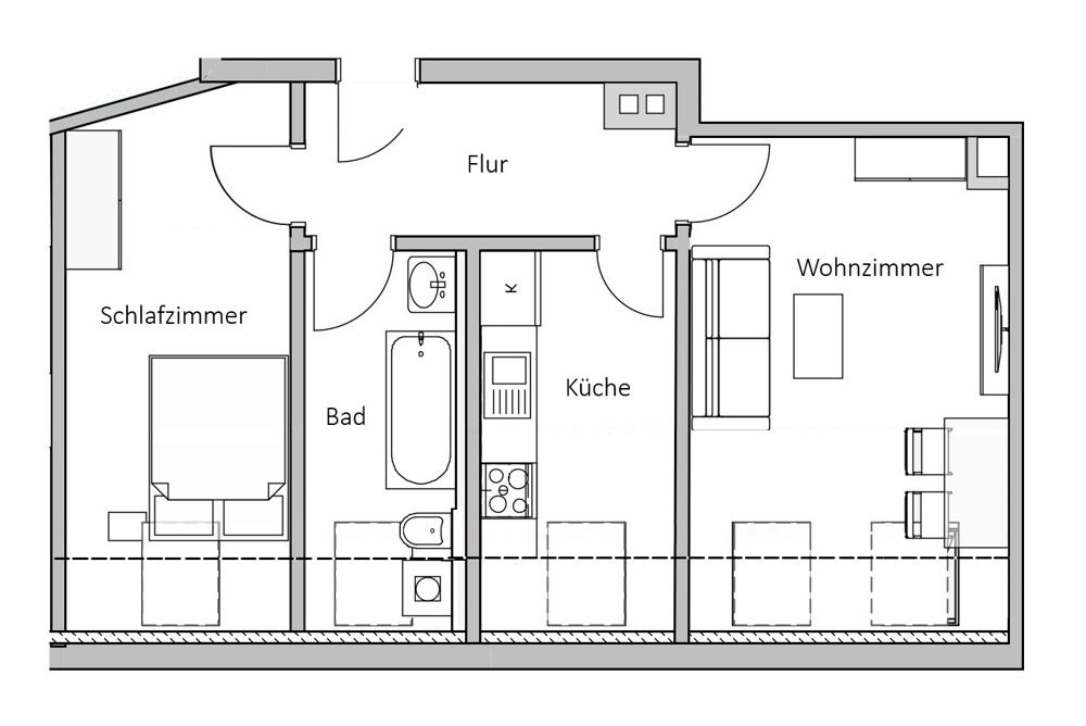 Die Wohnung umfasst zwei gut geschnittene Zimmer sowie ein stilvolles Tageslichtbad, das für eine angenehme Wohnatmosphäre sorgt. Die separate Küche bietet ausreichend Platz für individuelle Kochideen und kulinarische Entfaltung.