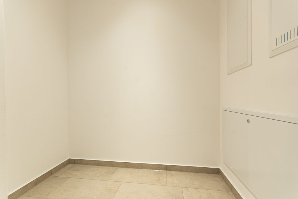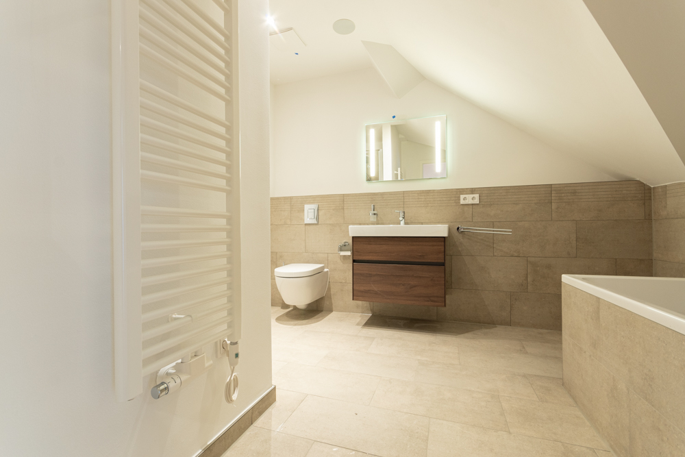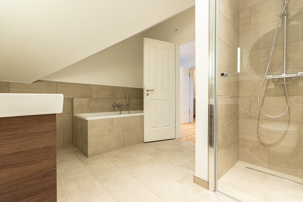 Das geschmackvoll gestaltete Badezimmer überzeugt mit einer Kombination aus Badewanne und separater Dusche und schafft eine angenehme Wohlfühlatmosphäre. Praktisch ergänzt wird das Raumangebot durch einen separaten Hauswirtschaftsraum mit Anschlussmöglichkeiten für Waschmaschine und Trockner.