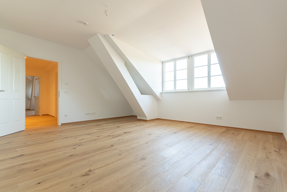 Hochwertiges Echtholzparkett in Eicheoptik sorgt in allen Wohnräumen für ein natürliches Ambiente, während die individuell regelbare Fußbodenheizung in jedem Raum angenehme Wärme garantiert. Holzfenster mit teilweise historischen Außenjalousien unterstreichen den besonderen Charakter dieser Wohnung und schaffen ein stimmiges Gesamtbild.
