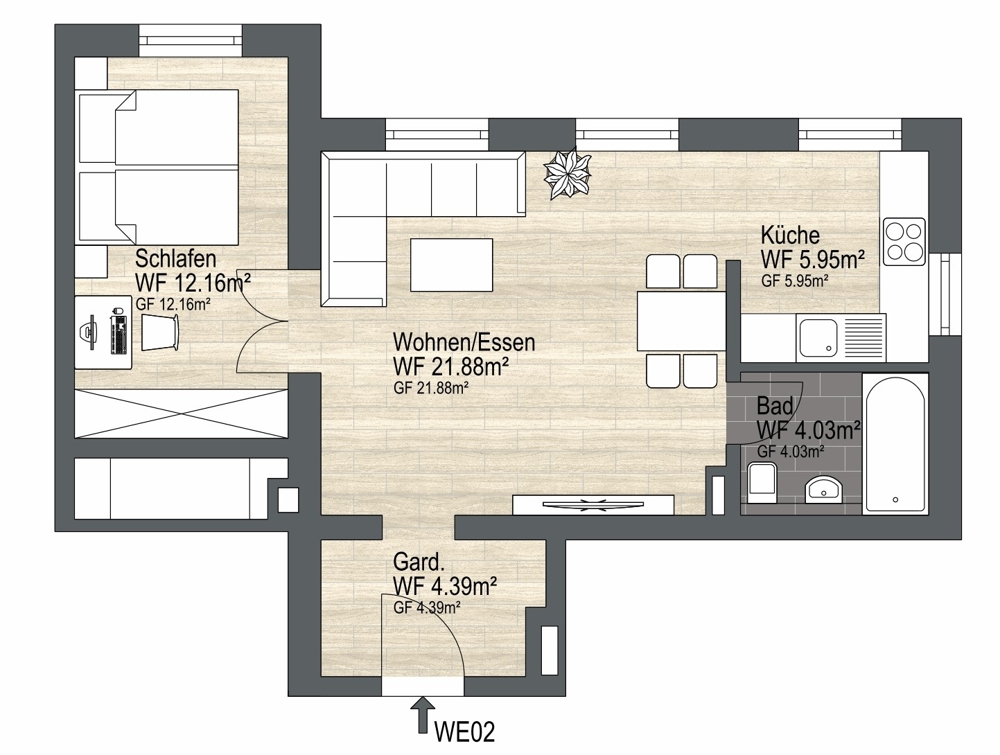 Auf rund 48 m² Wohnfläche präsentiert sich diese Wohnung mit zwei einladenden Zimmern und einer offenen Küche, die optimale Voraussetzungen für stilvolles Wohnen schafft. Das Bad ist mit einer Wanne ausgestattet. Der Wohnbereich überzeugt durch hochwertiges Parkett, welches eine warme und einladende Atmosphäre erzeugt.