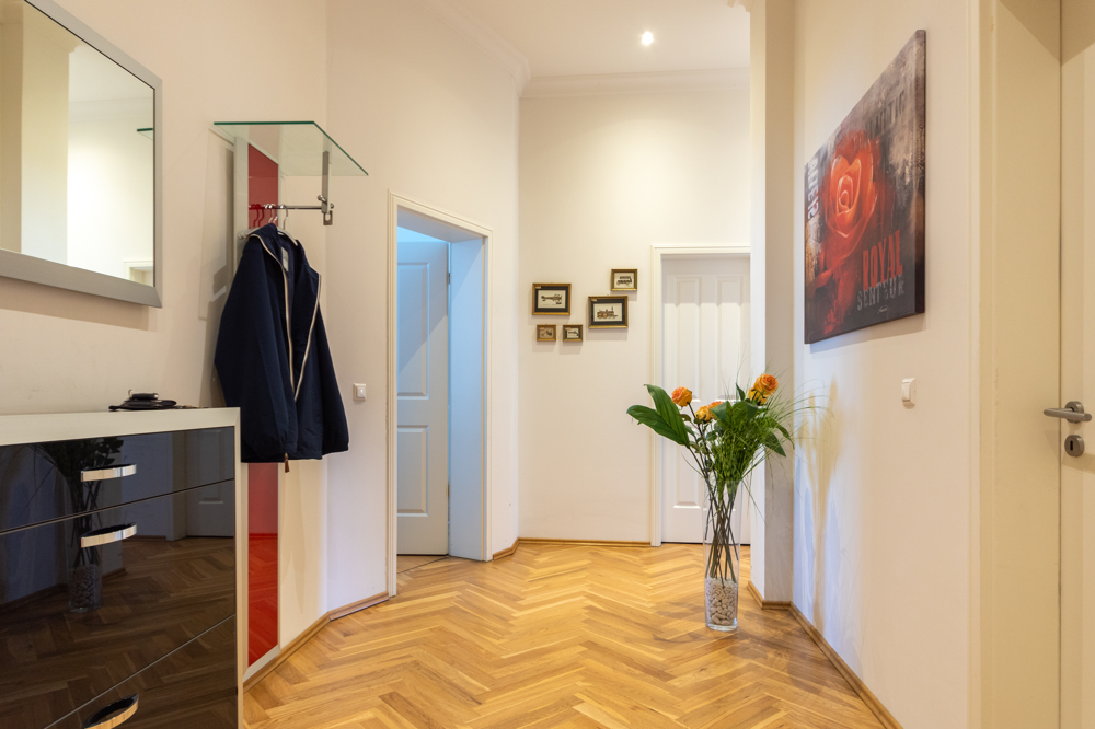 Bereits beim Betreten überzeugen die hohen Decken und ein edler Parkettboden im Fischgrätmuster, der in den Wohnräumen für eine warme, hochwertige Atmosphäre sorgt.