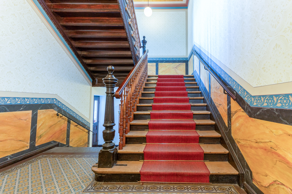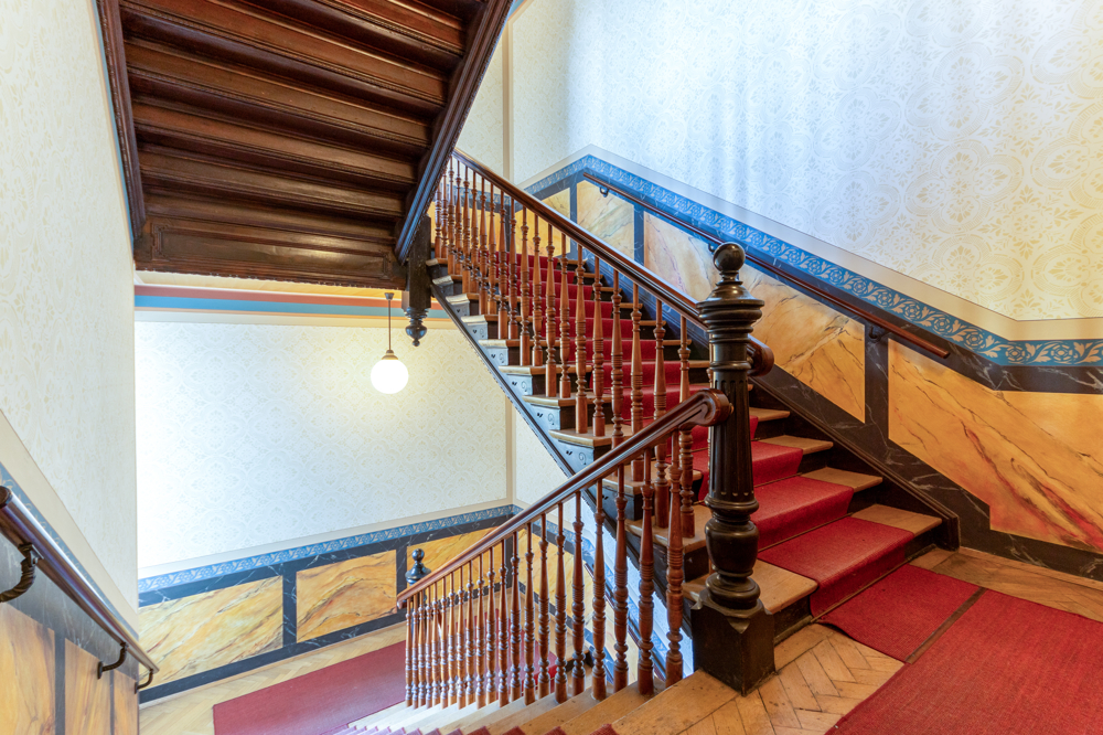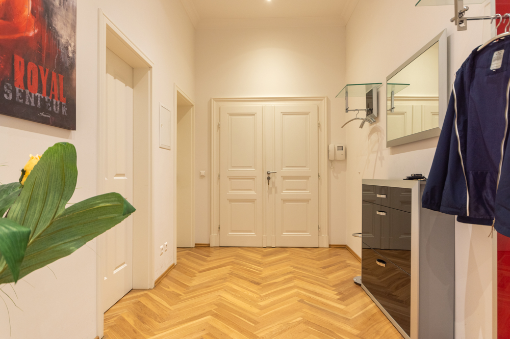 Bereits beim Betreten überzeugen die hohen Decken und ein edler Parkettboden im Fischgrätmuster, der in den Wohnräumen für eine warme, hochwertige Atmosphäre sorgt.