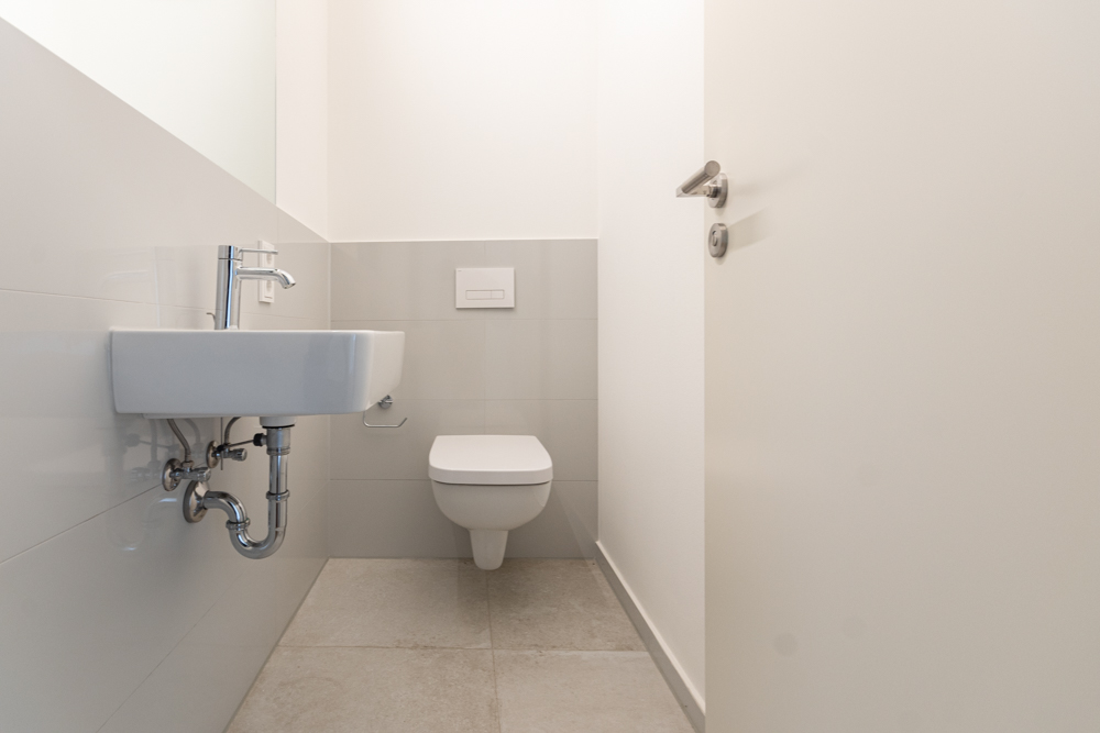 Ein geschmackvoll ausgestattetes Badezimmer mit modernen Fliesen, beleuchtetem Spiegel und praktischen Unterschränken bietet hohen Komfort. Zusätzlich steht Ihnen ein separates Gäste-WC zur Verfügung – perfekt für Besucher. Ein innenliegender Abstellraum sowie ein separater Kellerraum sorgen für ausreichend Stauraum.