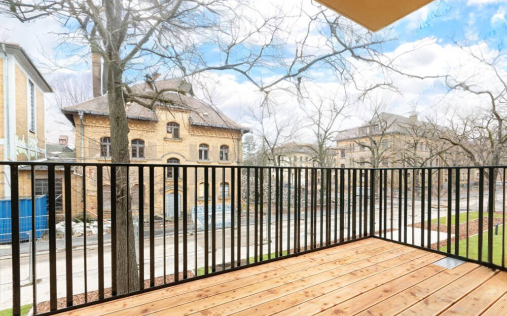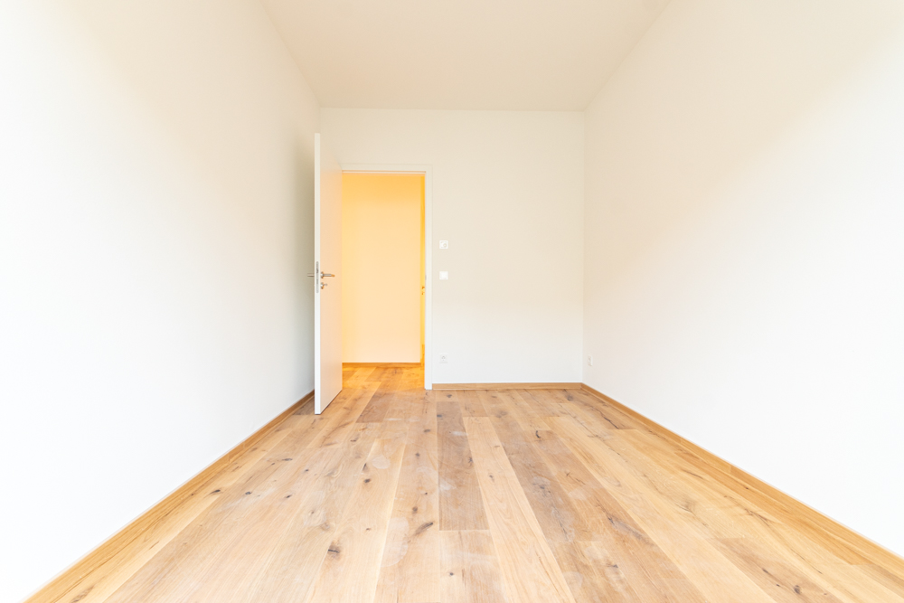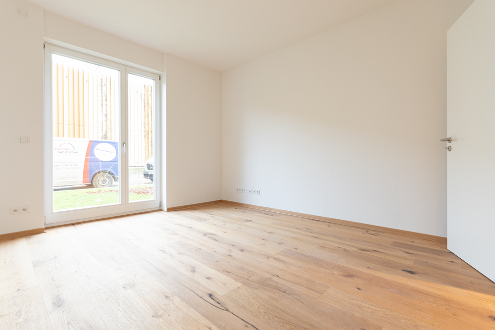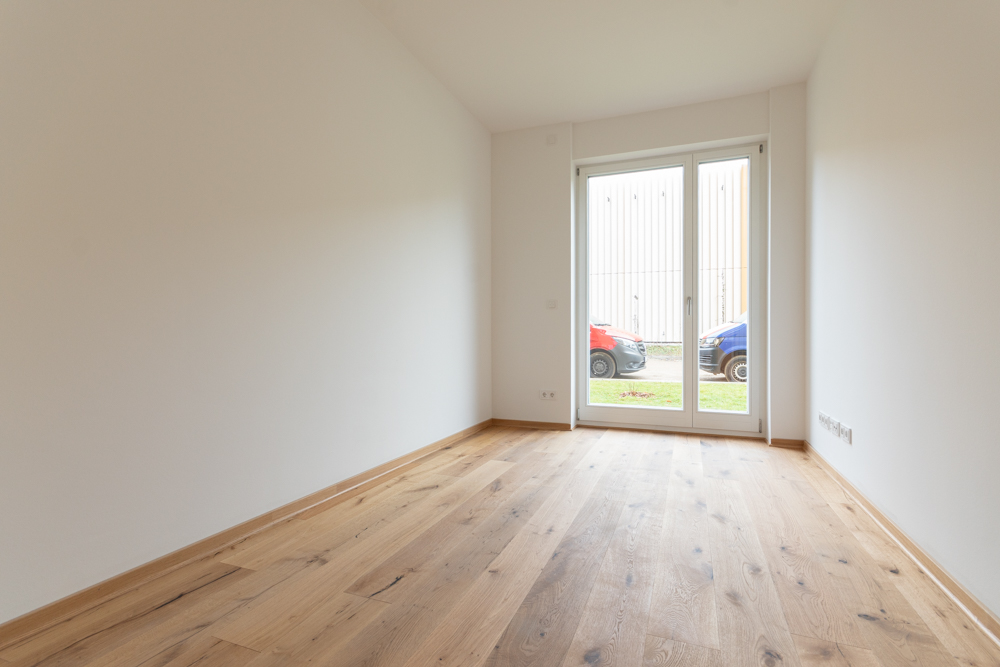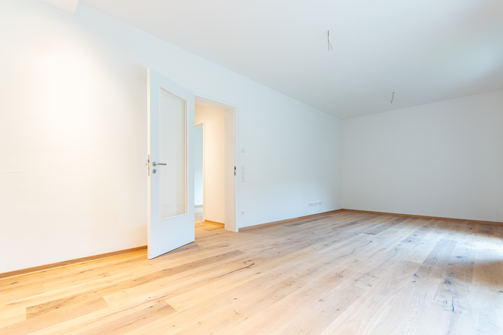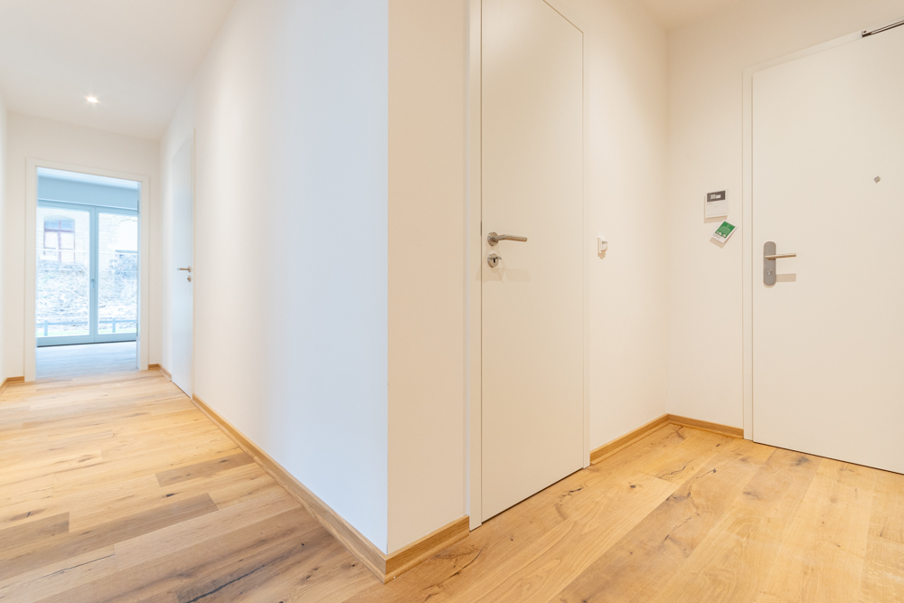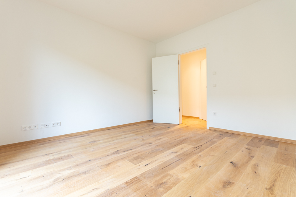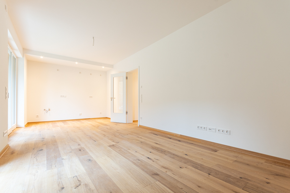 Der großzügige Wohnbereich mit offener Küche schafft ein helles und einladendes Raumgefühl, während der Balkon zusätzlichen Platz im Freien bietet – perfekt für entspannte Stunden und eine schöne Aussicht. Die Böden sind mit Echtholzparkett in Eicheoptik ausgestattet, das eine warme Atmosphäre schafft. Dank der individuell steuerbaren Fußbodenheizung in jedem Raum genießen Sie stets ein angenehmes Wohnklima.