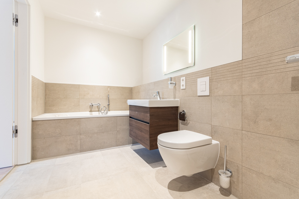 Das Badezimmer überzeugt durch eine moderne Ausstattung mit einer Badewanne, separater Dusche, großformatigen Designfliesen und hochwertigen Armaturen. Ein separater Hauswirtschaftsraum mit Waschmaschinenanschluss bietet zusätzlichen Komfort und Stauraum. Große Holzfenster sorgen für viel Tageslicht, während der elektrisch bedienbare Sicht- und Sonnenschutz für Privatsphäre und eine angenehme Raumtemperatur sorgt.