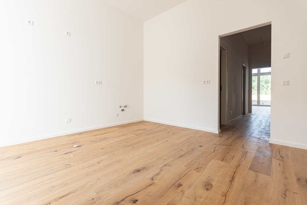 Der offen gestaltete Wohn- und Essbereich beeindruckt durch eine großzügige Fensterfront, die viel Tageslicht hereinlässt und einen direkten Zugang zur Terrasse – ein idealer Ort zum Entspannen im Freien.