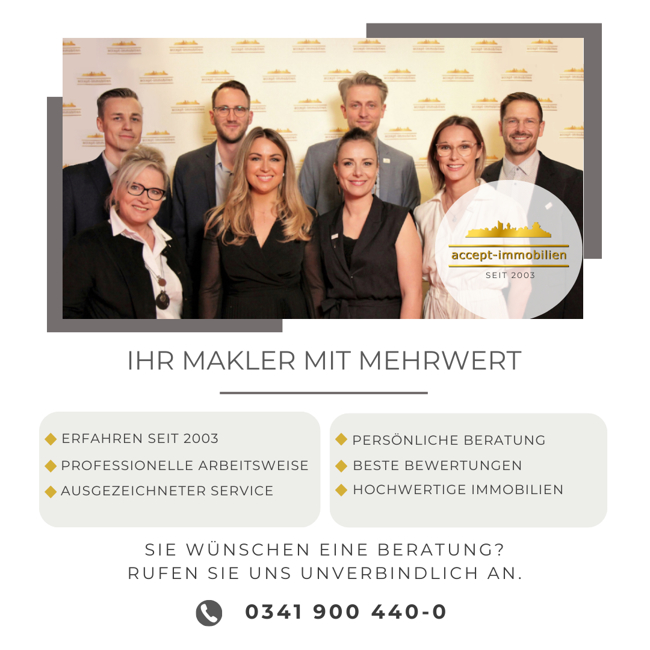 Interessiert? Zögern Sie nicht, uns unter der Telefonnummer 0341 900 440-0 zu kontaktieren, um einen Besichtigungstermin zu vereinbaren.