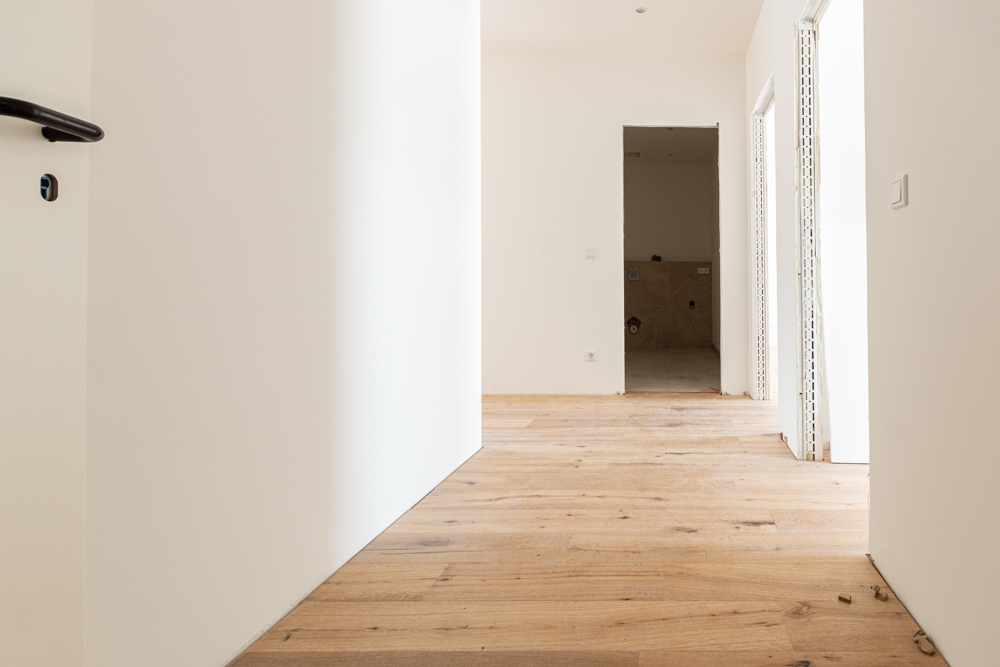 Der zentrale Flur verbindet alle Räume auf praktische Weise. Der lichtdurchflutete Wohnbereich mit offener Küche lädt zum gemeinsamen Kochen, Essen und Entspannen ein. Von hier aus gelangen Sie direkt auf den Balkon – ein ruhiger Rückzugsort für entspannte Stunden im Freien.