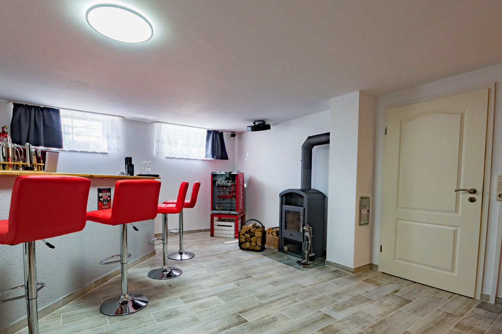 Ein echtes Highlight ist das voll ausgebaute Kellergeschoss, das weit über klassische Nutzfläche hinausgeht: Ein exklusives Homekino mit eigener Bar und Kamin schafft ein einzigartiges Ambiente für private Filmabende oder gesellige Runden. Ergänzt wird dieser Bereich durch ein gemütliches Gästezimmer – ideal für Besuch oder als separater Rückzugsraum.