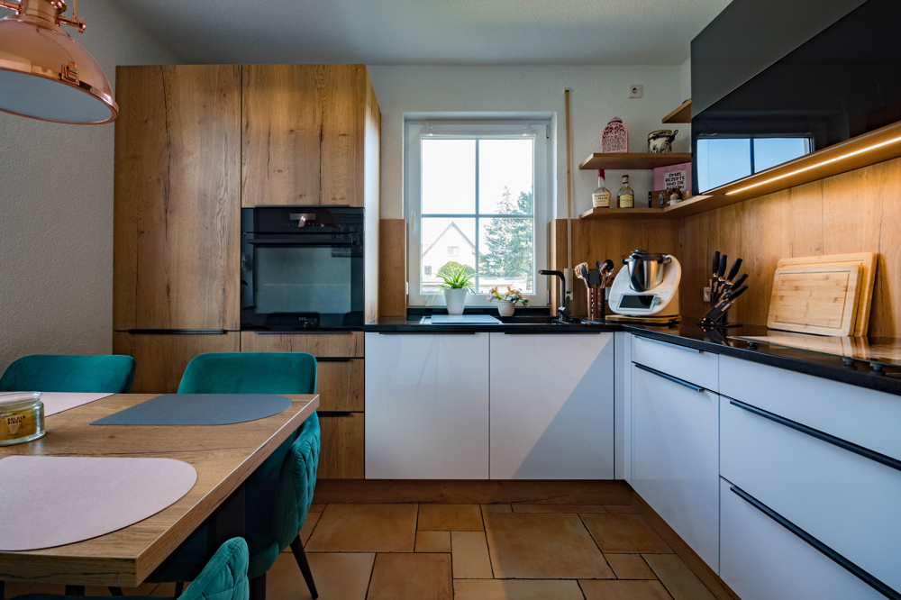 Die hochwertige, separate Einbauküche bietet viel Raum für gemeinsames Kochen und kulinarische Erlebnisse. Ein modernes Gäste-WC ergänzt das Erdgeschoss.