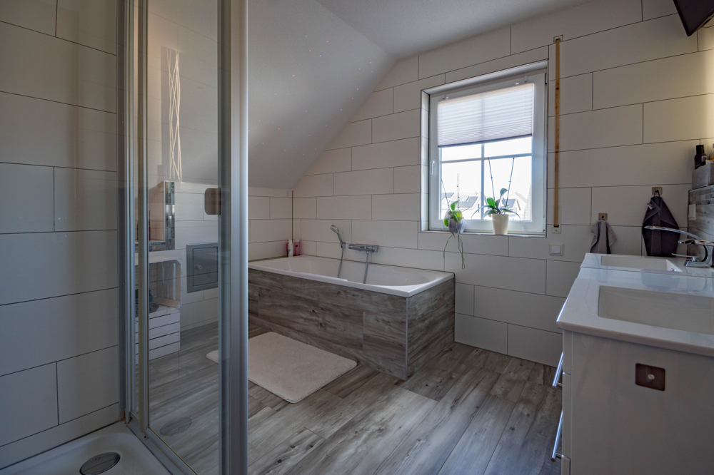 Im Obergeschoss erwartet Sie ein eleganter Rückzugsbereich: Das großzügige Tageslichtbad mit Badewanne und Dusche lädt zum Entspannen ein. Zwei geräumige Schlafzimmer sowie ein separates Ankleidezimmer bieten optimale Voraussetzungen für komfortables Familienleben. Besonders praktisch: der integrierte Wäscheschacht mit direkter Verbindung in den Keller.