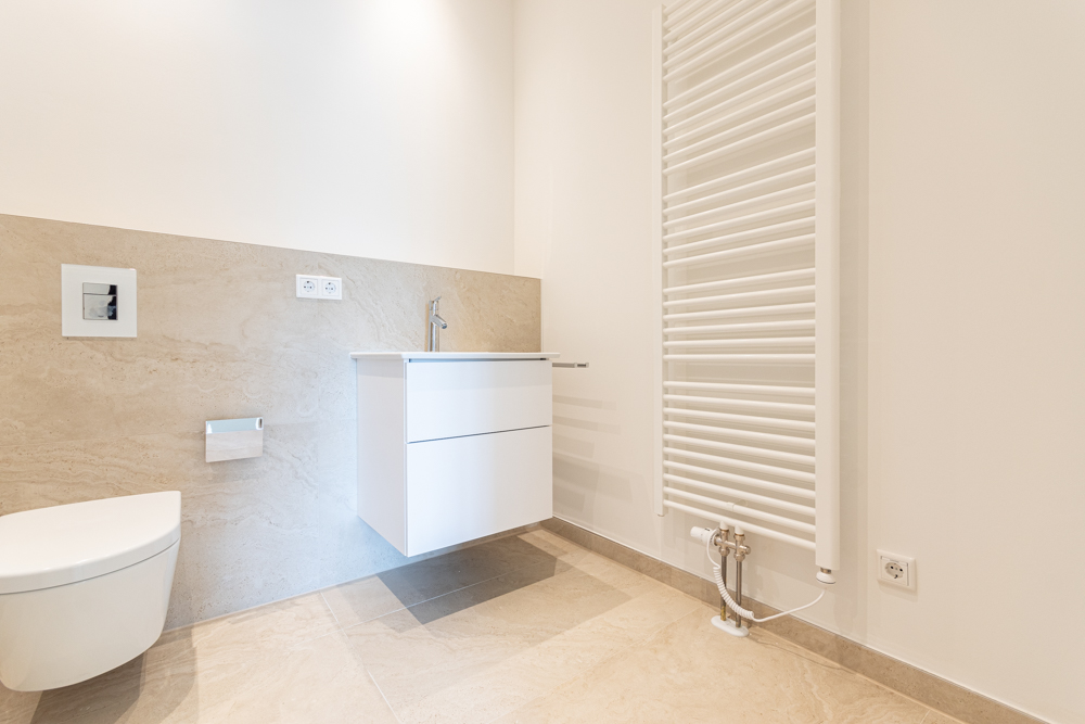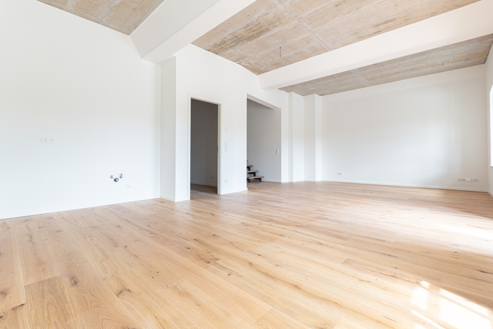 Die untere Ebene (2. Obergeschoss) bildet mit dem offen gestalteten Wohn- und Essbereich samt moderner Küche den Mittelpunkt der Wohnung. Bodentiefe Fenster sorgen für ein helles, luftiges Raumgefühl. Das absolute Highlight: die ca. 58 m² große Dachterrasse auf dem Wasserhochbehälter – eine seltene Besonderheit, die zum Sonnen, Entspannen und geselligen Beisammensein einlädt.