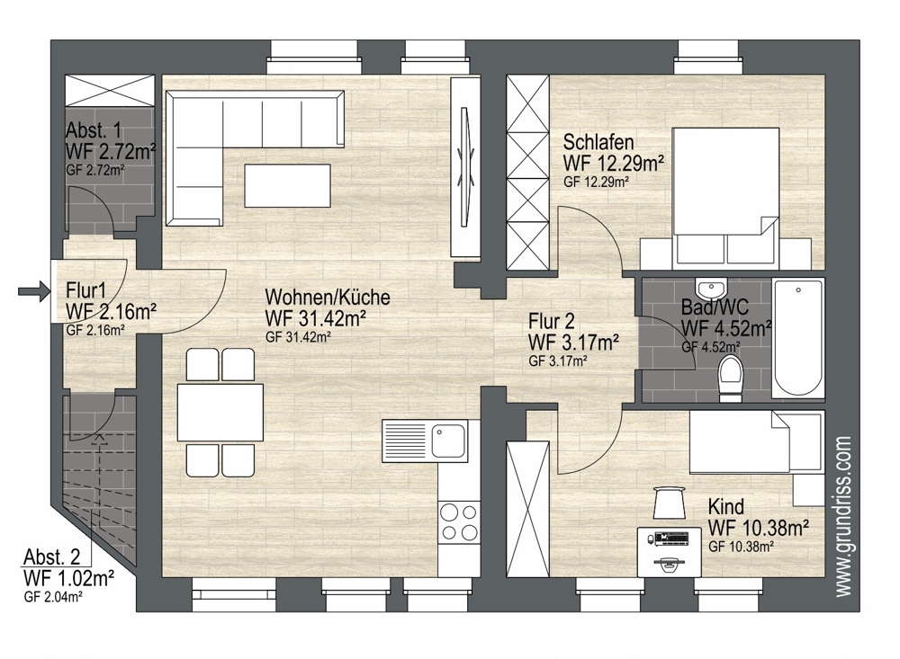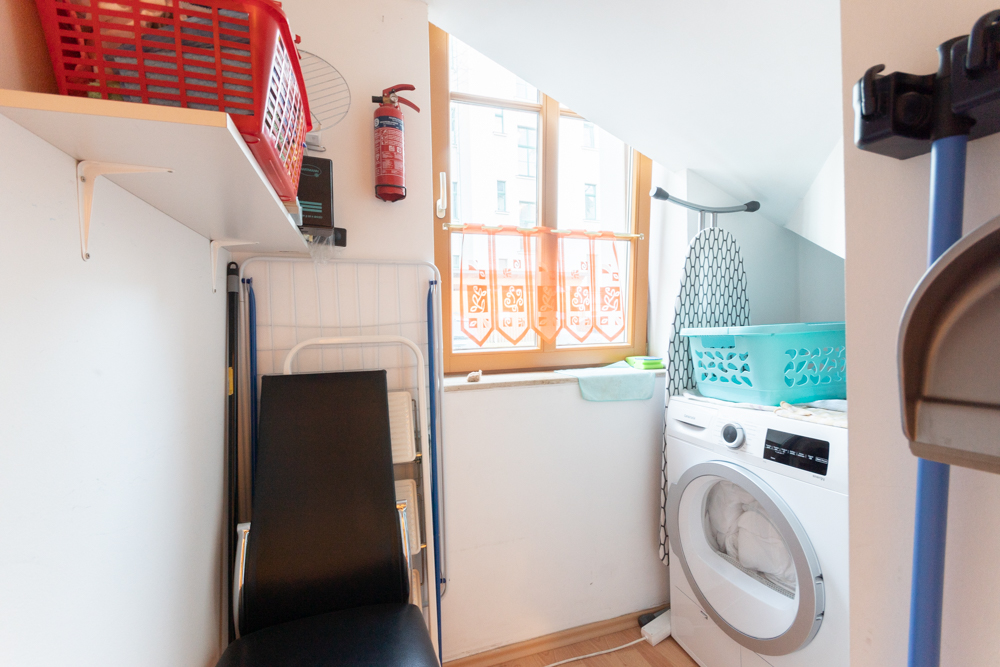 Das Badezimmer ist mit einer Badewanne ausgestattet und unterstreicht den funktionalen Komfort der Wohnung. Zusätzlichen Stauraum bieten zwei separate Abstellräume innerhalb der Wohnung – ein praktisches Plus für den Alltag.