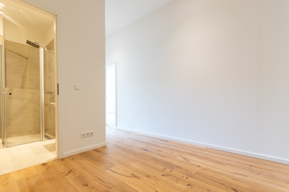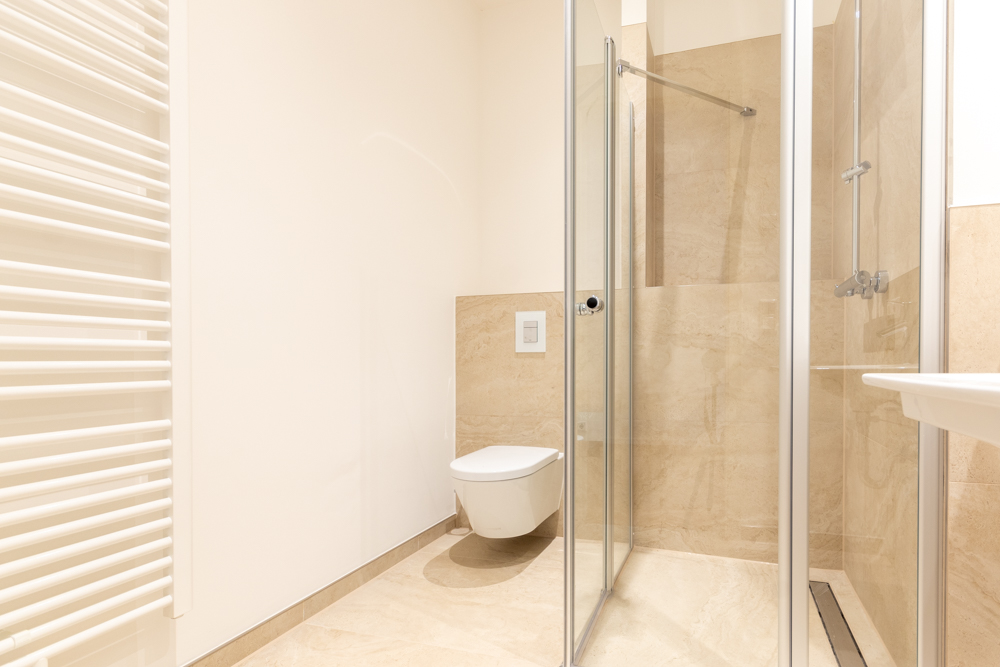 Ein modernes Bad mit bodengleicher Dusche, Badewanne und Waschmaschinenanschluss sowie ein weiteres Bad mit bodengleicher Dusche, runden das Raumangebot ab. Für zusätzlichen Stauraum eignet sich der Abstellraum hervorragend.